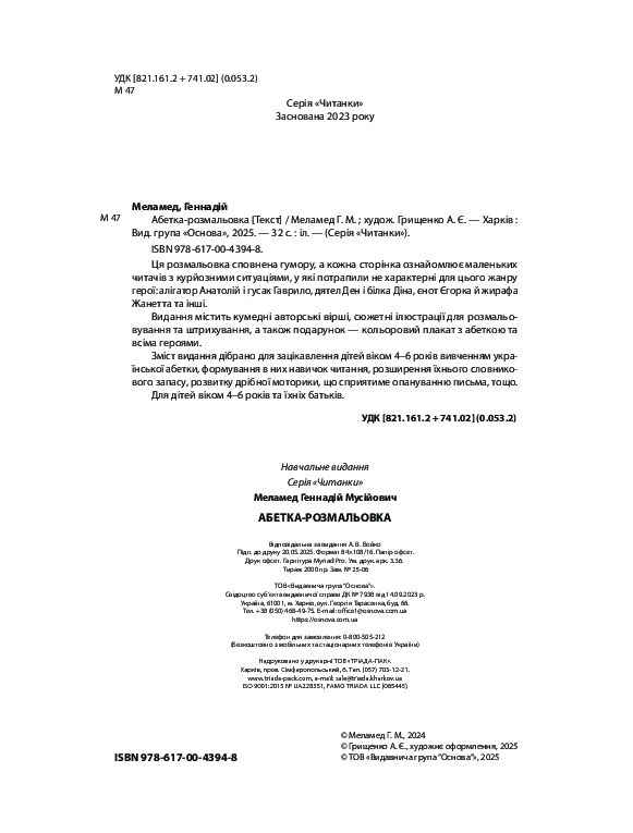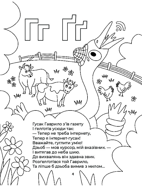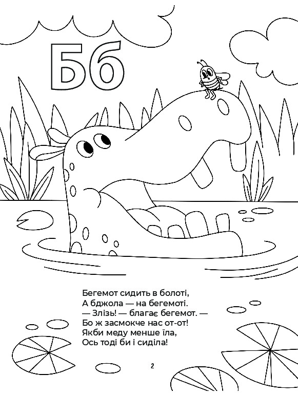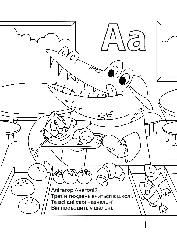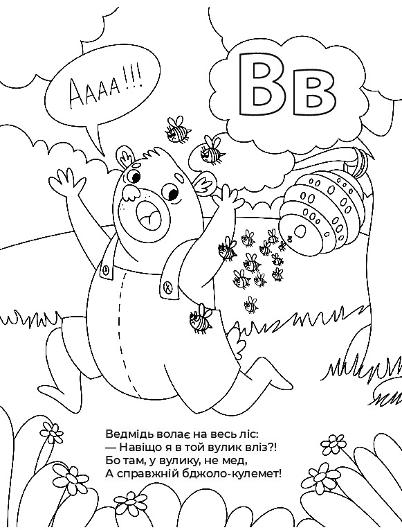 Видання містить кумедні авторські вірші, сюжетні ілюстрації для розмальовування та штрихування, а також подарунок — кольоровий плакат з абеткою та всіма героями.