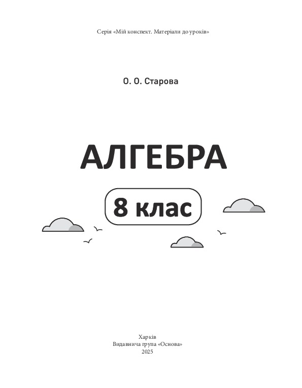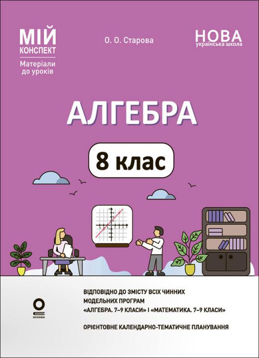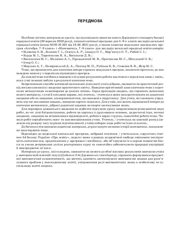 Посібник містить матеріали до уроків, дібрані відповідно до вимог нового Державного стандарту базової середньої освіти (30.09.2020), типової освітньої програми для 5–9-х класів закладів загальної середньої освіти (наказ МОН № 235 від 19.02.2021) та всіх чинних модельних навчальних програм «Алгебра. 7–9 класи» і «Математика. 7–9 класи».
