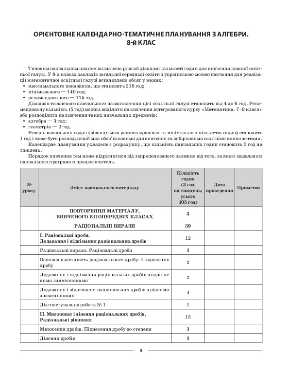 Орієнтовне календарно-тематичне планування з алгебри. 8-й клас . . . . 5