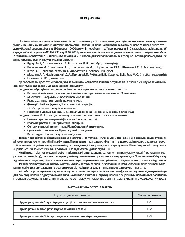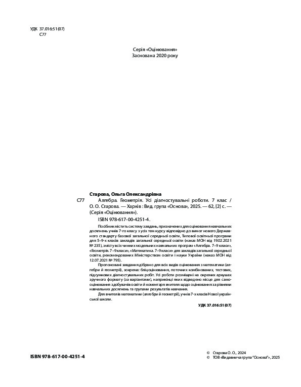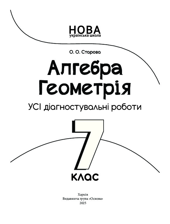 Посібник містить систему завдань, призначених для оцінювання навчальних досягнень учнів 7-го класу з усіх тем курсу відповідно до вимог нового Державного стандарту базової загальної середньої освіти, Типової освітньої програми для 5–9-х класів закладів загальної середньої освіти (наказ МОН від 19.02.2021 № 235), змісту всіх чинних модельних навчальних програм «Алгебра. 7–9 класи», «Геометрія. 7–9 класи», «Математика. 7–9 класи» для закладів загальної середньої освіти, рекомендованих Міністерством освіти і науки України (наказ МОН від 12.07.2021 № 795). Пропоновані завдання дібрано для всіх видів оцінювання з математики (алгебри й геометрії), зокрема: бліцоцінювання, поточних комбінованих, тестових, підсумкових діагностувальних робіт. Усі роботи розміщені на окремих аркушах зручного формату (за варіантами), наприкінці яких відведено місце для самооцінювання здобувачів освіти та коментаря вчителя.