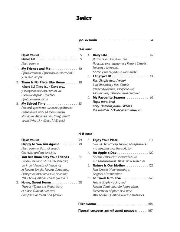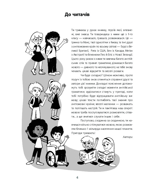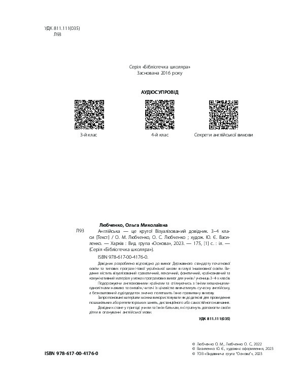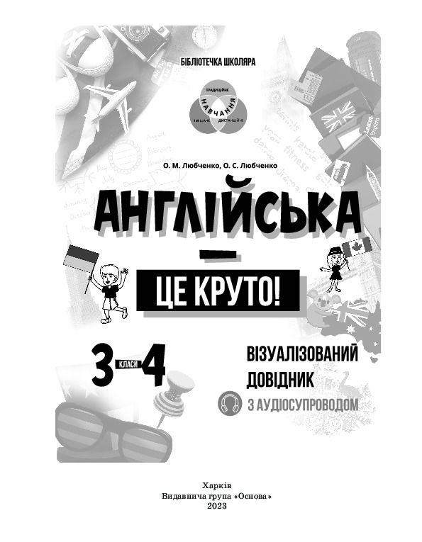 Довідник розроблено відповідно до вимог Державного стандарту початкової освіти та типових програм Нової української школи в галузі іншомовної освіти. Видання містить візуалізований граматичний, лексичний, фонетичний, країнознавчий та комунікативний матеріал у межах програмових вимог для учнів / учениць 3–4-х класів. Подорожуючи англомовними країнами та спілкуючись з їхніми мешканцями- однолітками наживо та онлайн, читачі із цікавістю вивчатимуть сучасну англійську, а безкоштовний аудіододаток значно полегшить їхню правильну вимову. Запропоновані матеріали можна використовувати як додаткові для позашкільних або репетиторських занять, дистанційного або самостійного навчання.