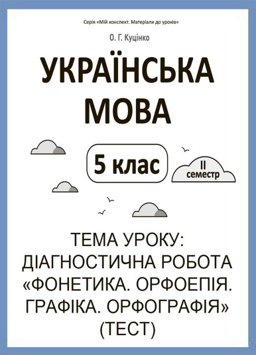 Конспект уроку в форматі PDF (2 стор.) з теми «Діагностична робота «Фонетика. Орфоепія. Графіка. Орфографія» (тест)» складено, зважаючи на всі наявні модельні навчальні програми «Українська мова. 5—6 класи» для закладів загальної середньої освіти, рекомендовані Міністерством освіти і науки України (наказ Міністерства освіти і науки України від 12.07.2021 № 795). Для вчителів української мови.
