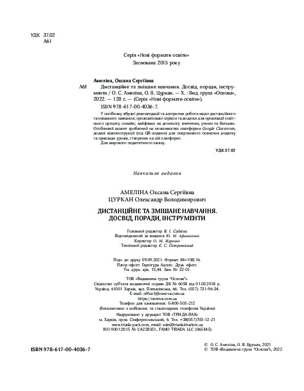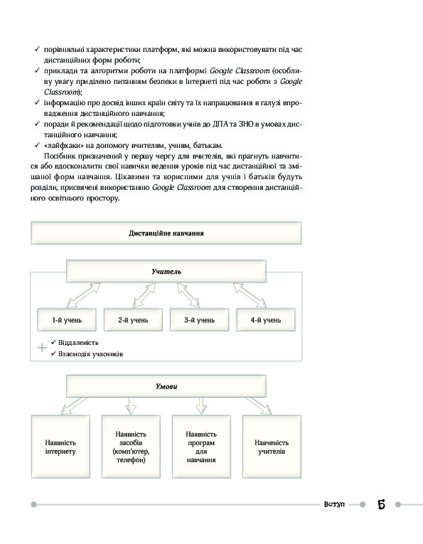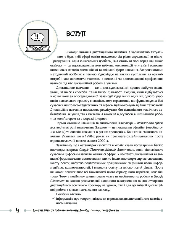 У посібнику зібрані рекомендації та алгоритми роботи щодо дистанційного та змішаного навчання; проаналізовані сервіси та додатки для організації освітнього процесу онлайн; лайфхаки на допомогу вчителям, учням та батькам. Особливий акцент зроблений на можливостях платформи Google Classroom, додані відеоінструкції (під QR-кодами) для покрокового освоєння додатку та приклади уроків, створених на цій платформі. Для широкого педагогічного загалу.