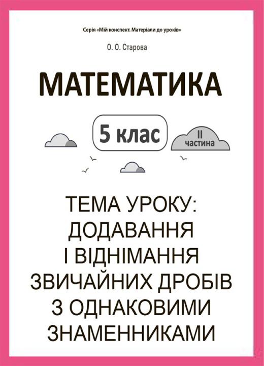 Конспект уроку в форматі PDF (13 стор.) з теми «Додавання і віднімання звичайних дробів з однаковими знаменниками» складено, відповідно вимогам нового Державного стандарту базової середньої освіти (30.09. 2020 р.), типової освітньої програми для 5–9 класів закладів загальної середньої освіти (наказ МОН № 235 від 19.02.2021 р.), а також вимогам усіх чинних модельних навчальних програм «Математика. 5–6 класи». Для вчителів математики.