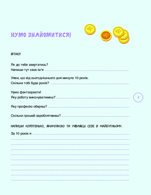 В ілюстрованому зошиті юний читач знайде важливі й стислі пояснення, різноманітні завдання про фінанси, їх заощадження та використання. Як зменшити комунальні платежі? Де надійніше зберігати гроші? За скільки років можна накопичити «мільйон»? Як вибирати подарунки? Де найкраща ціна на продукти? Що таке «прибутковий бізнес»? Отримати відповіді на ці та багато інших запитань дитина зможе, виконавши серії коротких завдань із кожної теми.