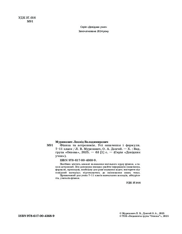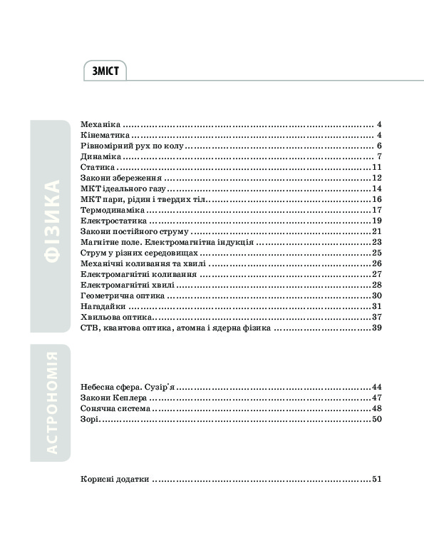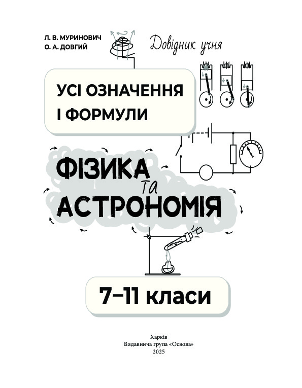 Посібник містить основні положення шкільного курсу фізики, а також астрономії. Він допоможе швидко знайти інформацію (означення, формули, приклади), необхідну для розв’язування задач; повторити відповідний матеріал; підготуватись до оцінювання знань тощо.
