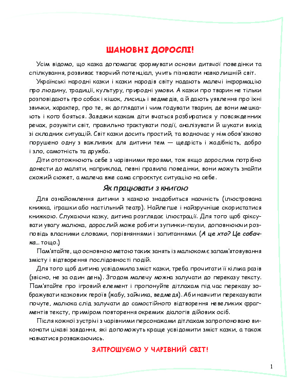 Ця книга запрошує хлопчиків та дівчаток у захопливу подорож казкою. На її сторінках на малечу чекають українські та європейські народні казки. Після кожної зустрічі з чарівними героями дітлахам запропоновано виконати цікаві завдання, які допоможуть краще освоїти зміст прочитаного, а також навчатися розважаючись.