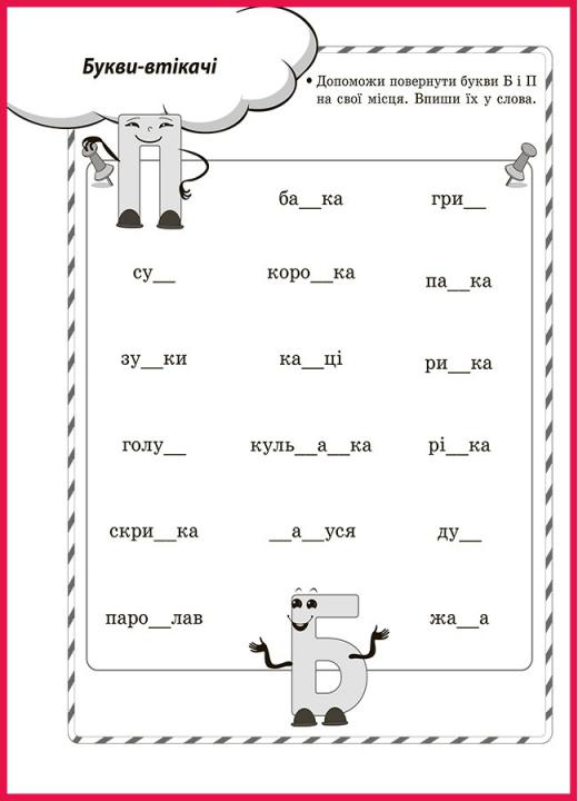Завдання: допоможи повернути букви Б і П на свої місця. Впиши їх у слова.