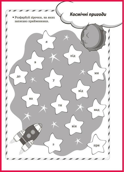 Завдання: розфарбуй зірочки, на яких записано прийменники