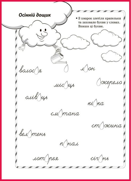 Завдання: з хмарок злетіли крапельки та заховали букви у словах. Впиши ці букви.