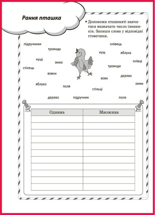 Завдання: допоможи пташеняті навчитися визначати число іменників. Запиши слова у відповідні стовпчики.
