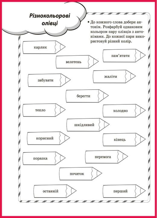 Завдання: до кожного слова добери антонім. Розфарбуй однаковим кольором пару олівців з антонімами. До кожної пари використовуй різний колір.