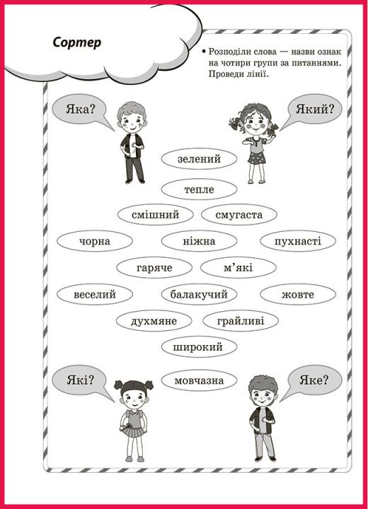 Завдання: розподіли слова — назви ознак на чотири групи за питаннями. Проведи лінії.