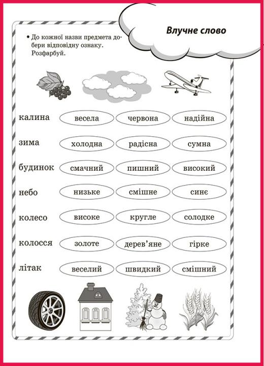 Завдання: до кожної назви предмета добери відповідну ознаку. Розфарбуй.
