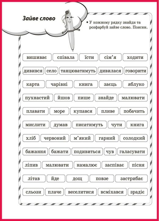 Завдання: у кожному рядку знайди та розфарбуй зайве слово. Поясни.