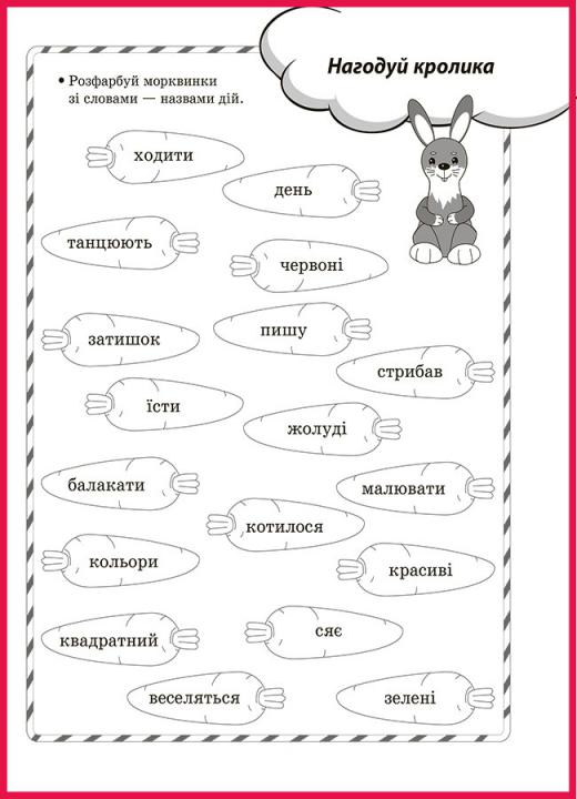 Завдання: розфарбуй морквинки зі словами — назвами дій.
