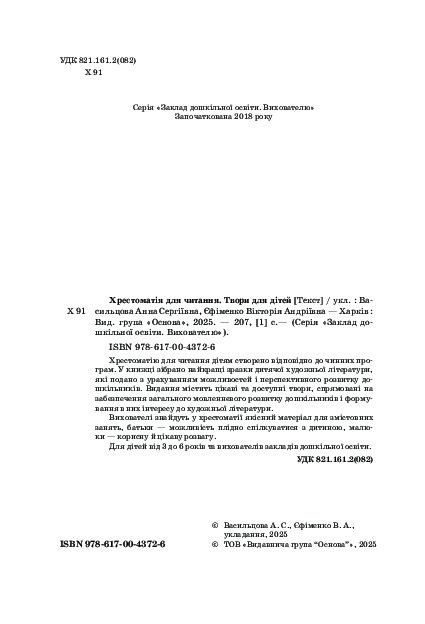 Хрестоматію для читання дітям створено відповідно до чинних програм. У книжці зібрано найкращі зразки дитячої художньої літератури, які подано з урахуванням можливостей і перспективного розвитку дошкільників. Видання містить цікаві та доступні твори, спрямовані на забезпечення загального мовленнєвого розвитку дошкільників і формування в них інтересу до художньої літератури.