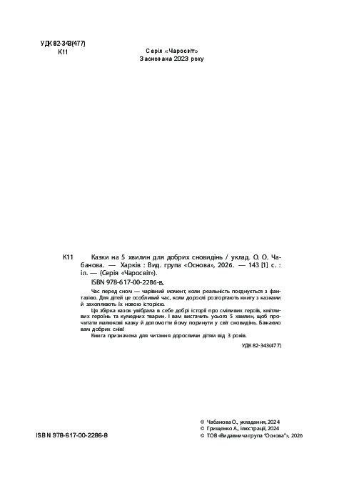 Ця збірка казок увібрала в себе добрі історії про сміливих героїв, кмітливих героїнь та кумедних тварин. І вам вистачить усього 5 хвилин, щоб прочитати малюкові казку й допомогти йому поринути у світ сновидінь. Бажаємо вам добрих снів!