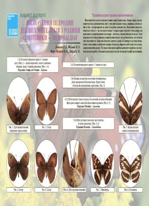 Два кольорових плаката для використання в якості демонстраційного матеріалу на уроках біології. Визначник базується на комплексі певних ознак будови комах. Кожна ознака, яка використовується для визначення, існує у двох протилежних станах, наприклад, крила темні або крила прозорі. Всі ознаки ілюстровані оригінальними фотографіями, які значно полегшують роботу. До кожної родини надається дві-три фотографії представників.