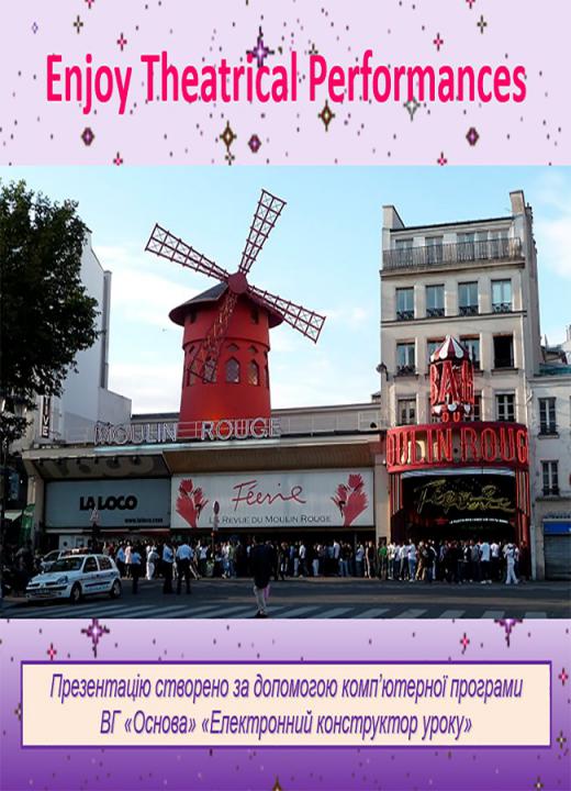 Презентація в форматі Ppt плюс конспект у форматі Doc (3 стр.) до уроку №39. Enjoy Theatrical Performances. 7 клас (за підручником А. М. Несвіт).