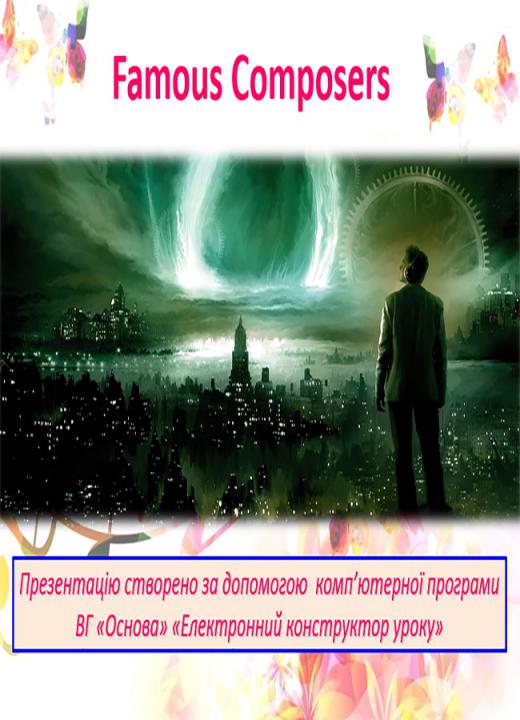 Презентація в форматі Ppt плюс конспект у форматі Doc (3 стр.) до уроку №51. Famous Composers. 8 клас (за підручником А. М. Несвіт).