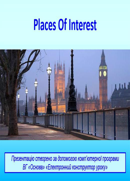 Презентація в форматі Ppt плюс конспект у форматі Doc (3 стр.) до уроку №56. Places Of Interest. 7 клас (за підручником О. Д. Карп’юк).