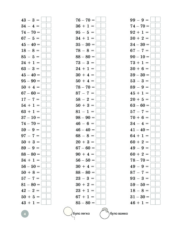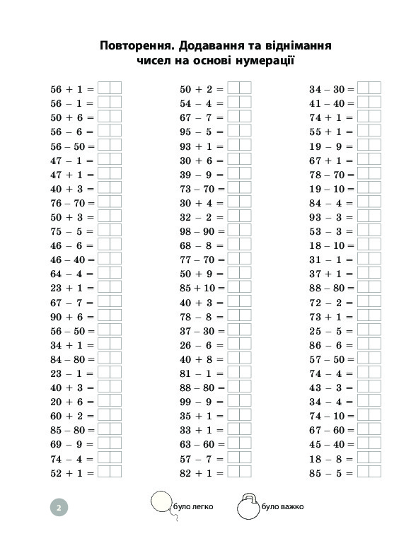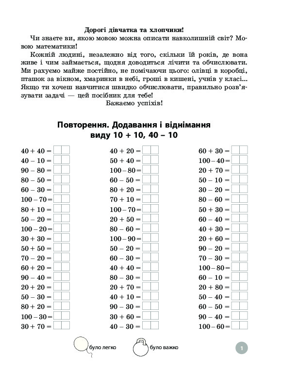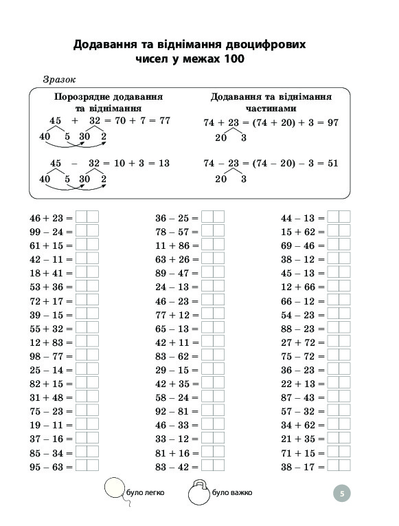 У посібнику наведено умовні позначки, за допомогою яких учні можуть оцінити свої уміння після виконання завдань: було важко або було легко. Посібник стане в пригоді як для самостійної роботи, так і для використання на уроках математики