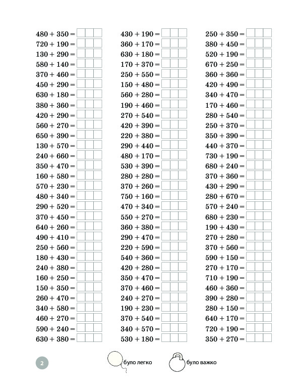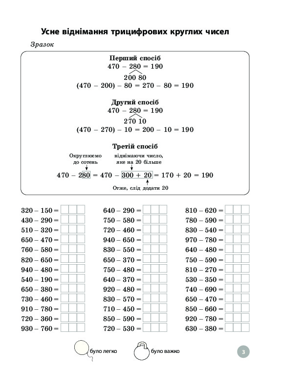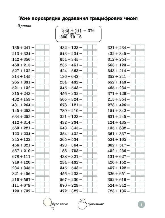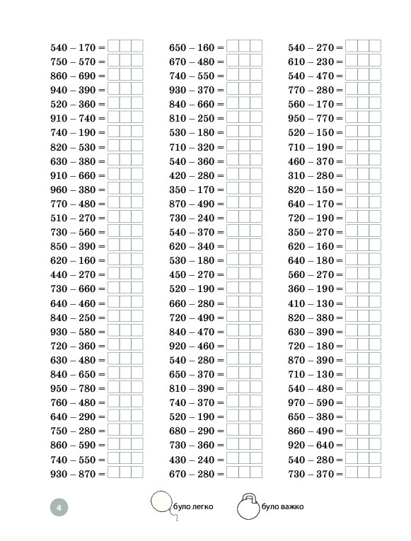 У посібнику наведено умовні позначки, за допомогою яких четверокласники можуть оцінити свої вміння після виконання завдань: було важко або було легко. Універсальний посібник стане в пригоді як для самостійної роботи, так і для використання на уроках математики, сприяючи розвитку логічного мислення, уваги та швидкості обчислень.