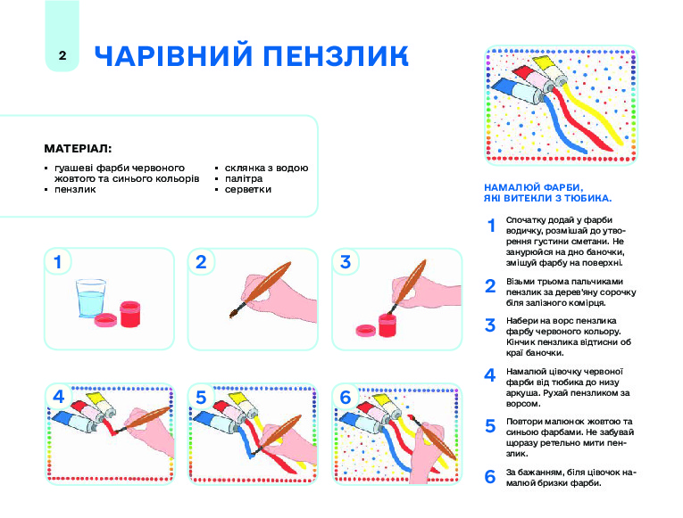 Альбом містить 31 заняття з малювання, матеріали з покроковими інструкціями та аркуші-основи з відповідним фоном і певними елементами для домальовування або оздоблення. Відповідно до програми розвитку дітей 3–4 років дібрано теми для малювання різними засобами: гуашевими фарбами, кольоровими олівцями. Передбачено малювання традиційними й нетрадиційними техніками (зубною щіткою, ватяними паличками, трубочками для коктейлю, пальчиками, відбитками природного матеріалу та іншими).