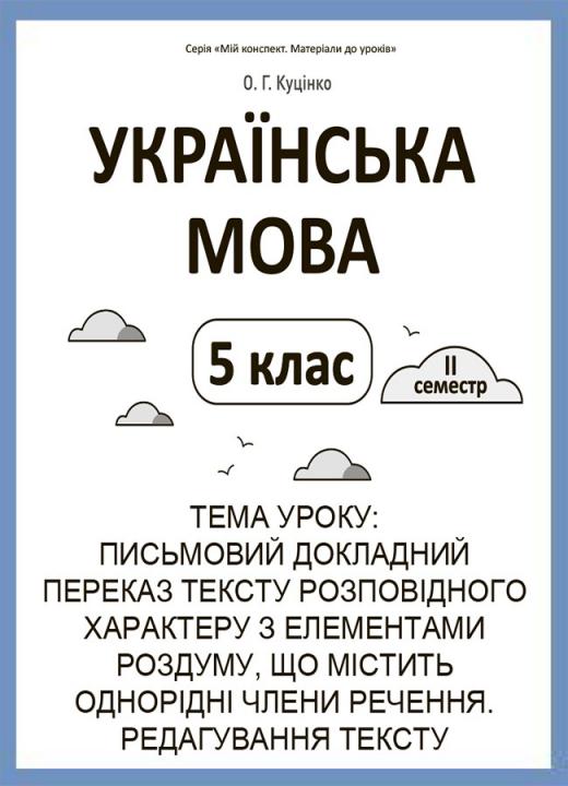 Конспект уроку в форматі PDF (3 стор.) з теми «Письмовий докладний переказ тексту розповідного характеру з елементами роздуму, що містить однорідні члени речення. Редагування тексту» складено, зважаючи на всі наявні модельні навчальні програми «Українська мова. 5—6 класи» для закладів загальної середньої освіти, рекомендовані Міністерством освіти і науки України (наказ Міністерства освіти і науки України від 12.07.2021 № 795). Для вчителів української мови.