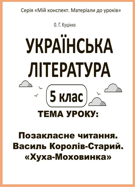 Конспект уроку у форматі PDF (3 стор.) з теми «Позакласне читання. Василь Королів-Старий. «Хуха-Моховинка»» складено, у відповідності до основних модельних навчальних програм — Модельна навчальна програма «Українська література. 5—6 класи» для закладів загальної середньої освіти (автори: Архипова В. П., Січкар С. І., Шило С. Б.); Модельна навчальна програма «Українська література. 5—6 класи» для закладів загальної середньої освіти (автори: Яценко Т. О., Качак Т. Б., Кизилова В. В., Пахаренко В. І., Дячок С. О., Овдійчук Л. М., Слижук О. А., Макаренко В. М., Тригуб І. А.). Для вчителів української літератури.