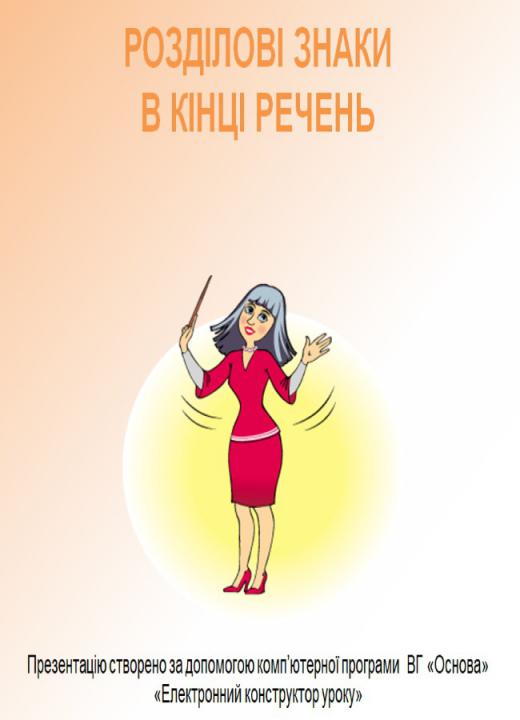 Презентація у форматі ppt плюс конспект у форматі doc (4 стр.) до уроку № 57. Розділові знаки в кінці речень. 3 клас 2 семестр. Презентація складена у повній відповідності з розробкою уроку, складається з 13 слайдів: базових понять, ілюстрацій, пояснень до них і дидактичних матеріалів. Для вчителів початкових класів.