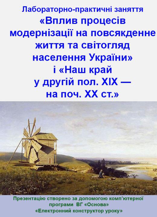 Презентація в форматі. рpt плюс конспект у форматі. doc до уроку № 50–51. Лабораторно-практичні заняття «Вплив процесів модернізації на повсякденне життя та світогляд населення України» і «Наш край у другій половині ХІХ — на початку ХХ ст.». 9 клас