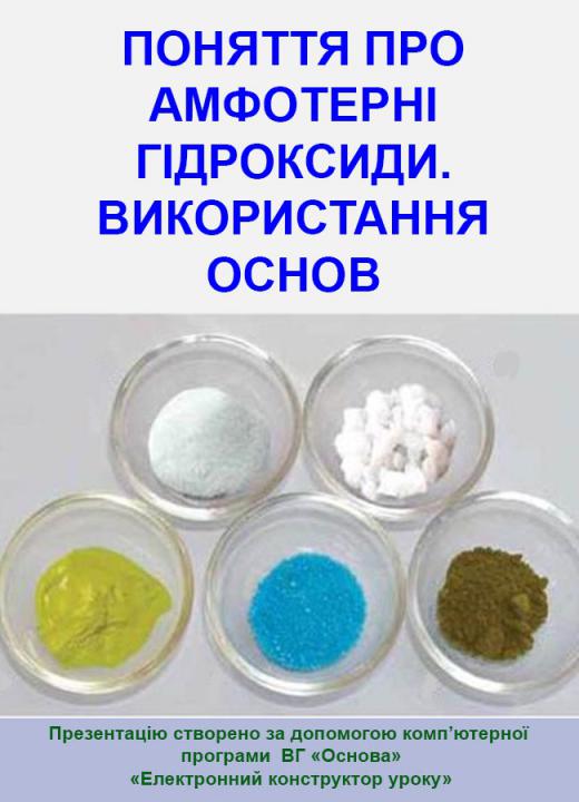 Презентація в форматі. рpt плюс конспект у форматі. doc до уроку Презентація та конспект до уроку № 54. Поняття про амфотерні гідроксиди.Використання основ. 8 клас Презентація складена у повній відповідності з розробкою уроку, складається з 13 слайдів: базових понять, ілюстрацій, пояснень до них і дидактичних матеріалів. Для вчителів хімії.
