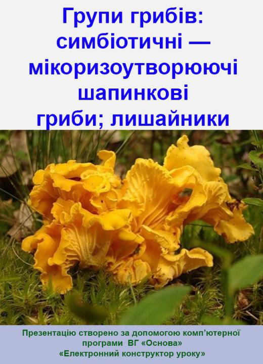 Презентація в форматі. рpt плюс конспект у форматі. doc до уроку № 56. Групи грибів: симбіотичні — мікоризоутворюючі шапинкові гриби; лишайники. 6 клас