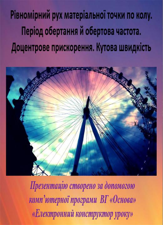 Тема уроку. Рівномірний рух матеріальної точки по колу. Період обертання й обертова частота. Доцентрове прискорення. Кутова швидкість