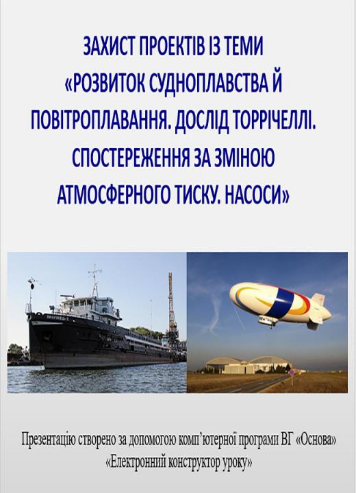 Презентація в форматі Ppt плюс конспект у форматі Doc (8 стр.) до уроку №57. Захист проектів із теми «Розвиток судноплавства й повітроплавання. Дослід Торрічеллі. Спостереження за зміною атмосферного тиску. Насоси». 7 клас. Презентація складена у повній відповідності з розробкою уроку, складається з 13 слайдів: базових понять, ілюстрацій, пояснень до них і дидактичних матеріалів. Для вчителів фізики.