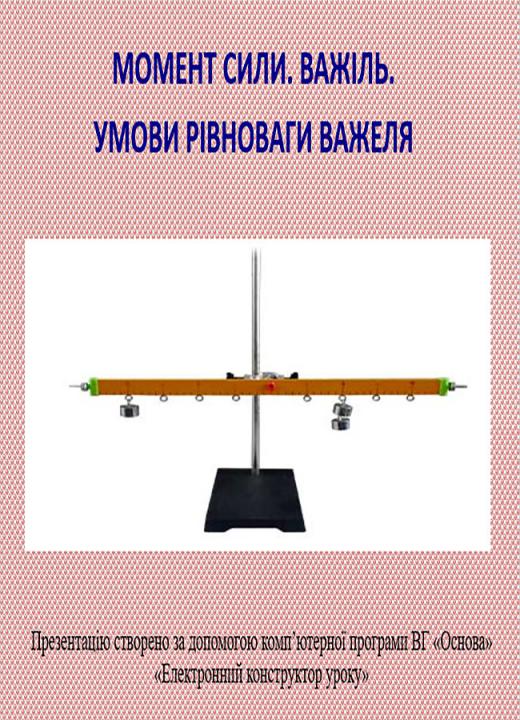 Презентація в форматі Ppt плюс конспект у форматі Doc (10 стр.) до уроку №62. Момент сили. Важіль. Умови рівноваги важеля. 7 клас. Презентація складена у повній відповідності з розробкою уроку, складається з 12 слайдів: базових понять, ілюстрацій, пояснень до них і дидактичних матеріалів. Для вчителів фізики.