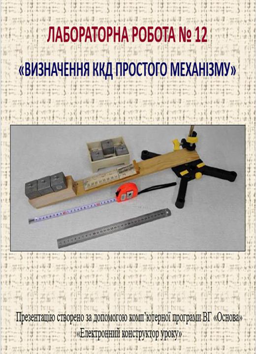 Презентація в форматі Ppt плюс конспект у форматі Doc (5 стр.) до уроку №66. Лабораторна робота №12 «Визначення ККД простого механізму». 7 клас. Презентація складена у повній відповідності з розробкою уроку, складається з 14 слайдів: базових понять, ілюстрацій, пояснень до них і дидактичних матеріалів. Для вчителів фізики.