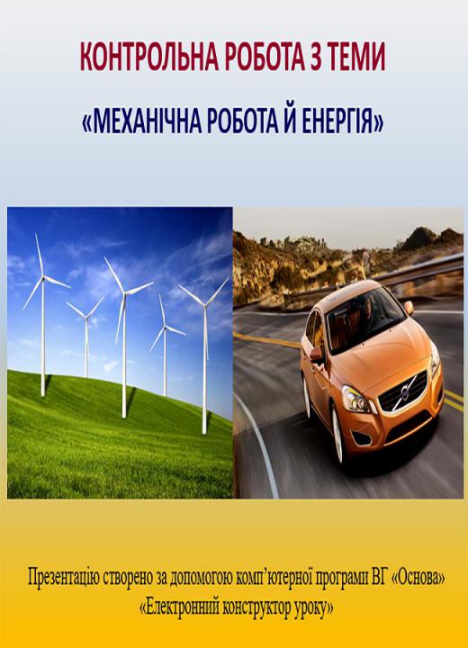 Презентація в форматі Ppt плюс конспект у форматі Doc (4 стр.) до уроку №68. Контрольна робота з теми «Механічна робота й енергія». 7 клас. Презентація складена у повній відповідності з розробкою уроку, складається з 14 слайдів: базових понять, ілюстрацій, пояснень до них і дидактичних матеріалів. Для вчителів фізики.
