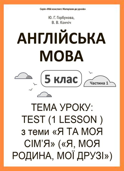 Конспект уроку в форматі PDF (2 стор.) з теми «Test (1 Lesson ) з теми «Я ТА МОЯ СІМ’Я» («Я, МОЯ РОДИНА, МОЇ ДРУЗІ»)» складено, відповідно двох основних модельних навчальних програм для закладів загальної середньої освіти: «Іноземна мова 5—9 класи» (автори: В. Г. Редько, О. П. Шаленко, С. І. Сотникова, О. Я. Коваленко, І. Б. Коропецька, О. М. Якоб, І. В. Самойлюкевич, О. М. Добра, Т. М. Кіор) та «Іноземна мова 5—9 класи» (автори: І. М. Зимомря, В. А. Мойсюк, М. С. Тріфан, І. К. Унгурян, М. В. Яковчук), рекомендованих Міністерством освіти і науки України (наказ Міністерства освіти і науки України від 12.07.2021 № 795). Для вчителів англійської мови, які з 2022—2023 навчального року впроваджуватимуть модель НУШ у 5 класі закладів загальної середньої освіти.