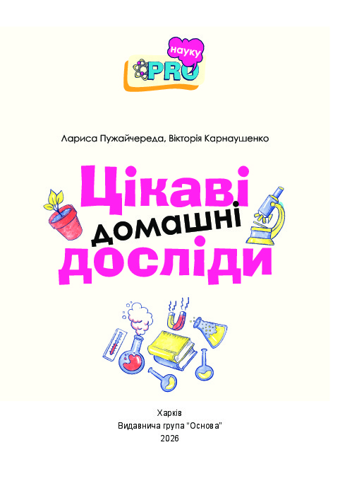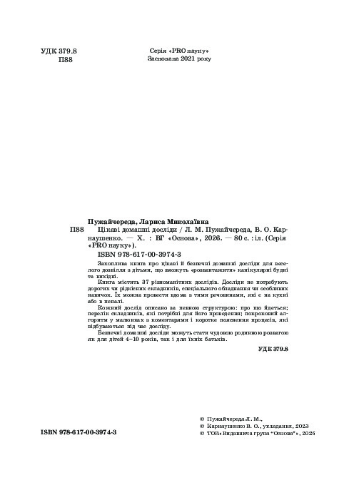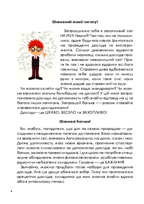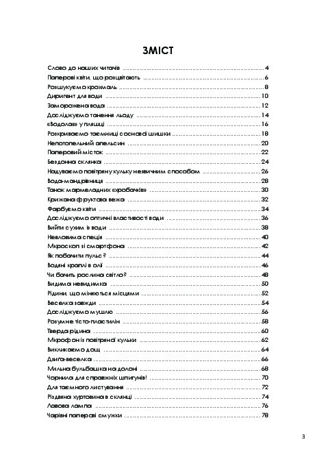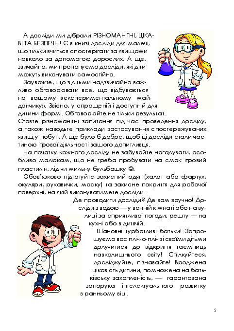Захоплива книга про цікаві й безпечні домашні досліди для веселого дозвілля з дітьми, що зможуть «розвантажити» канікулярні будні та вихідні. Книга містить 37 різноманітних дослідів. Досліди не потребують дорогих чи рідкісних складників, спеціального обладнання чи особливих навичок. Їх можна провести вдома з тими речовинами, які є на кухні або в пеналі. Кожний дослід описано за певною структурою: про що йдеться; перелік складників, які потрібні для його проведення; покроковий алгоритм у малюнках з коментарями і коротке пояснення процесів, які відбуваються під час досліду. Безпечні домашні досліди можуть стати чудовою родинною розвагою як для дітей 4–10 років, так і для їхніх батьків.