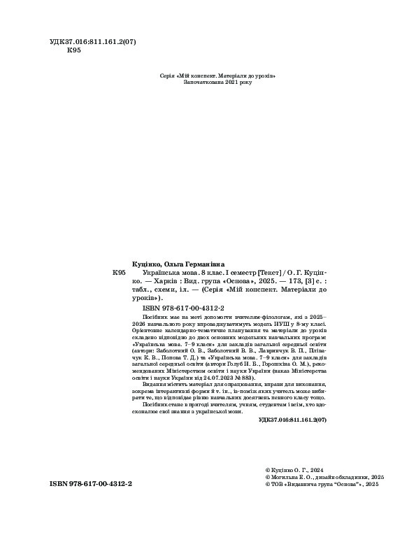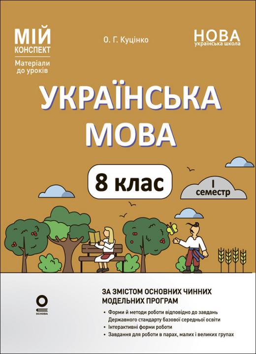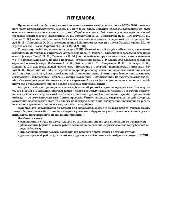 Посібник має на меті допомогти вчителям-філологам, які з 2025–2026 навчального року впроваджуватимуть модель НУШ у 8-му класі. Орієнтовне календарно-тематичне планування та матеріали до уроків складено відповідно до двох основних модельних навчальних програм: «Українська мова. 7–9 класи» для закладів загальної середньої освіти (автори: Заболотний О. В., Заболотний В. В., Лавринчук В. П., Плівачук К. В., Попова Т. Д.) та «Українська мова. 7–9 класи» для закладів загальної середньої освіти (автори Голуб Н. Б., Горошкіна О. М.), рекомендованих Міністерством освіти і науки України (наказ Міністерства освіти і науки України від 24.07.2023 № 883).