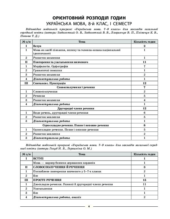 Орієнтовний розподіл годин. Українська мова, 8-й клас, І семестр . . . 4