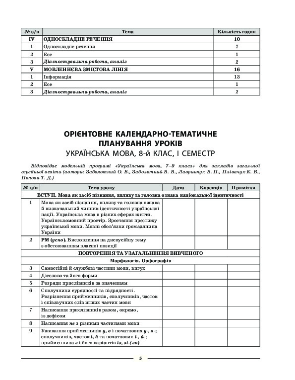 Орієнтовне календарно-тематичне планування уроків. Українська мова, 8-й клас, І семестр (Відповідає модельній програмі «Українська мова, 7–9 класи» для закладів загальної середньої освіти (автори: Заболотний О. В., Заболотний В. В., Лавринчук В. П., Плівачук К. В., Попова Т. Д.)) . . . . 5