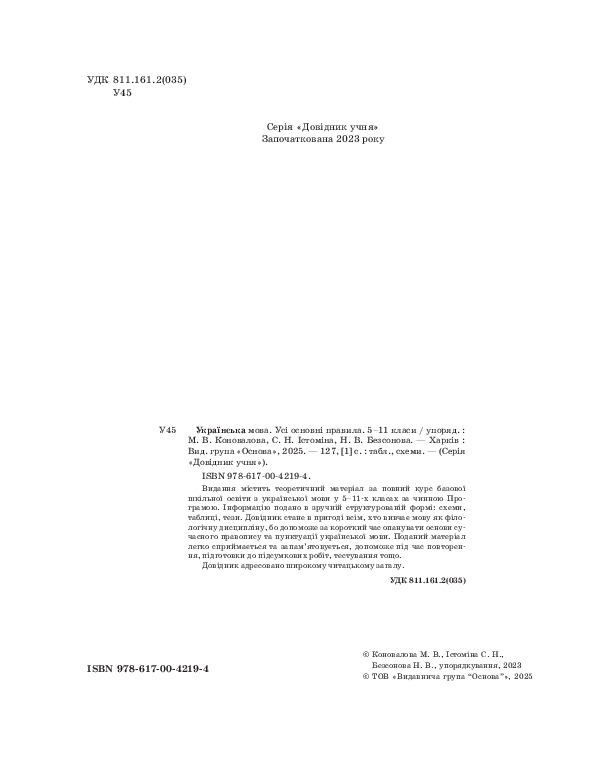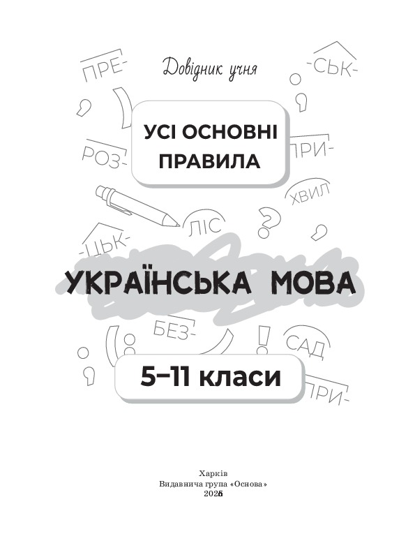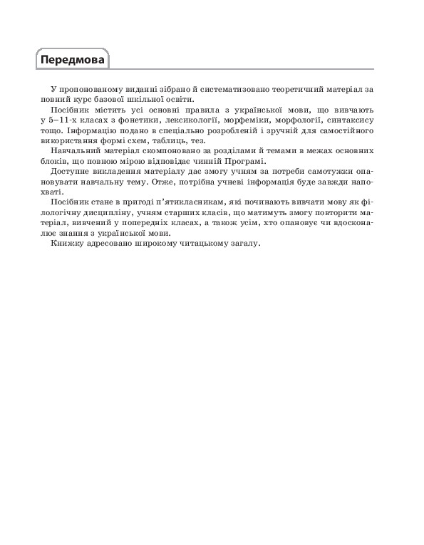 Видання містить теоретичний матеріал за повний курс базової шкільної освіти з української мови у 5–11-х класах за чинною Програмою. Інформацію подано в зручній структурованій формі: схеми, таблиці, тези. Довідник стане в пригоді всім, хто вивчає мову як філологічну дисципліну, бо допоможе за короткий час опанувати основи сучасного правопису та пунктуації української мови. Поданий матеріал легко сприймається та запам’ятовується, допоможе під час повторення, підготовки до підсумкових робіт, тестування тощо.