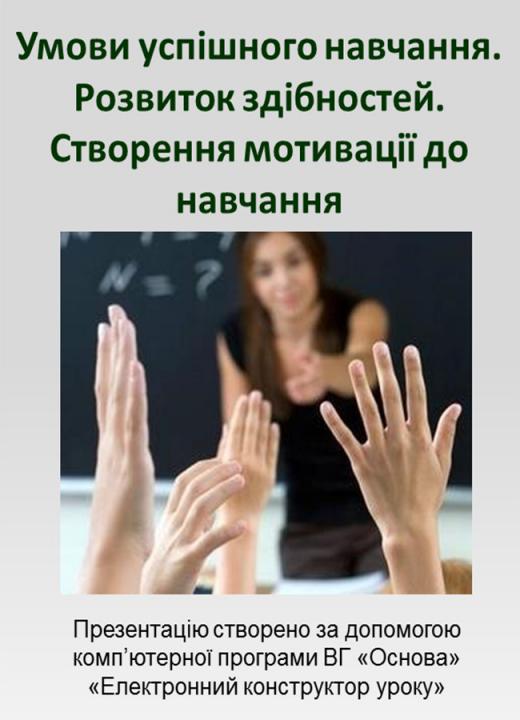 Презентація у форматі ppt (13 слайдів) плюс конспект у форматі doc (11 стор.) до уроку «Умови успішного навчання. Розвиток здібностей. Створення мотивації до навчання». Презентація складена у повній відповідності з розробкою уроку: базових понять, ілюстрацій, пояснень до них і дидактичних матеріалів. Для вчителів курсу «Основи здоров’я. 5 клас».