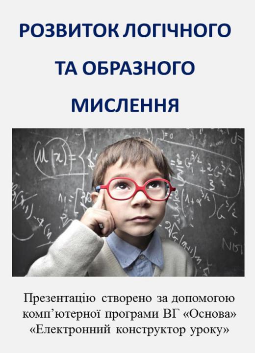 Презентація у форматі ppt (22 слайдів) плюс конспект у форматі doc (9 стор.) до уроку «Розвиток логічного та образного мислення». Презентація складена у повній відповідності з розробкою уроку: базових понять, ілюстрацій, пояснень до них і дидактичних матеріалів. Для вчителів курсу «Основи здоров’я. 8 клас».