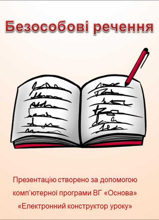 Презентація у форматі ppt (11 слайдів) плюс конспект у форматі doc (5 стор.) до уроку «Безособові речення». Презентація складена у повній відповідності з розробкою уроку: базових понять, ілюстрацій, пояснень до них і дидактичних матеріалів. Для вчителів курсу «Українська мова. 8 клас».