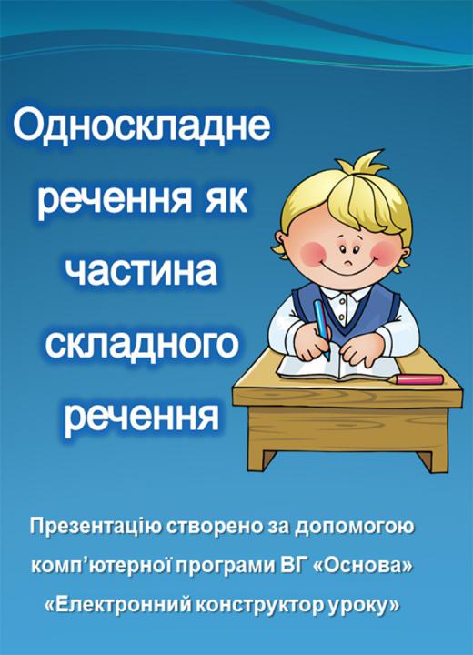 Презентація у форматі ppt (13 слайдів) плюс конспект у форматі doc (4 стор.) до уроку «Односкладне речення як частина складного речення». Презентація складена у повній відповідності з розробкою уроку: базових понять, ілюстрацій, пояснень до них і дидактичних матеріалів. Для вчителів курсу «Українська мова. 8 клас».